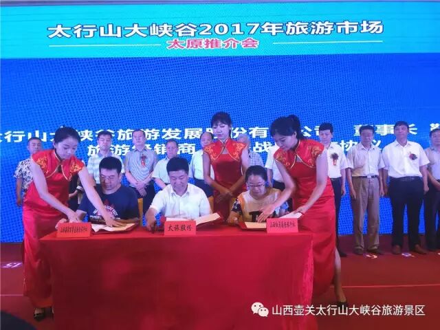 长治市太行山大峡谷旅游开发管理中心主任、壶关县旅游事业发展中心主任、太旅股份董事长靳海棠与太原太行风情、 山西维信国际等6家旅行社代表签订了旅游战略合作协议,双方自愿结成太行山大峡谷旅游市场开发战略合作伙伴,共同打造太行山大峡谷旅游品牌。